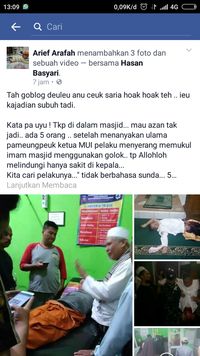 "Tkp di dalam masjid... mau azan tak jadi.. ada 5 orang.. setelah menanyakan ulama pameungpeuk ketua MUI pelaku menyerang memukul imam masjid menggunakan golok.. tp Allohloh melindungi hanya sakit di kepala..," kata pemilik akun dalam kolom komentar.